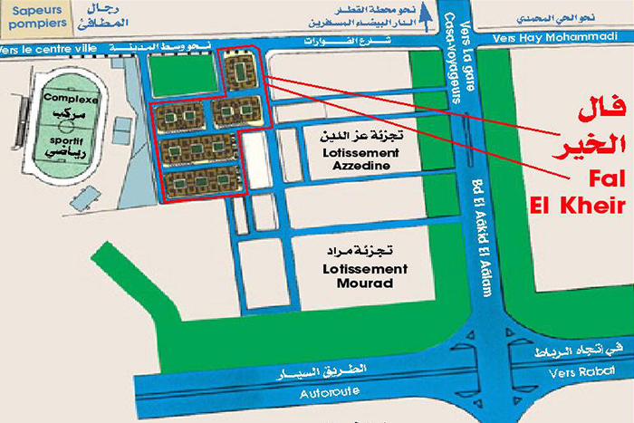 La Résidence Fal El Kheir fait partie des projets économiques du Groupe EL FAL Immobilier. Située dans la ville de Casablanca, plus précisément à FOUARAT, elle est composée de 575 appartements et de 5 commerces.